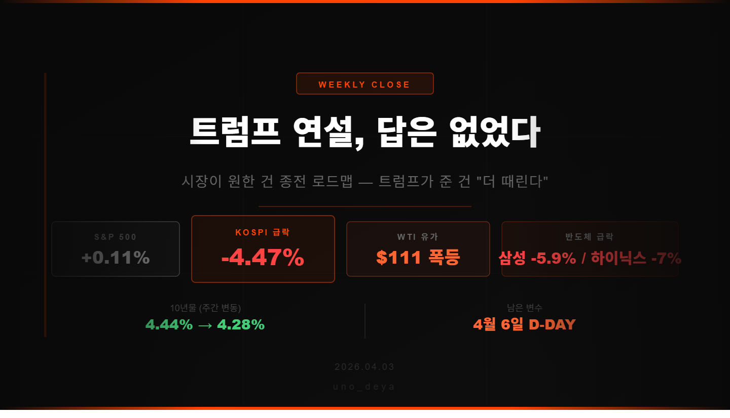 시장이 원한 건 "언제, 어떻게 끝나는가"였다. 트럼프가 준 건 "더 때린다. 근데 곧 끝난다"였다. 그 모순이 시장을 혼란에 빠뜨렸다. WTI가 연설 직후 +11% 폭등해 배럴당 111달러를 찍었다. 2022년 6월 이후 최고치다.