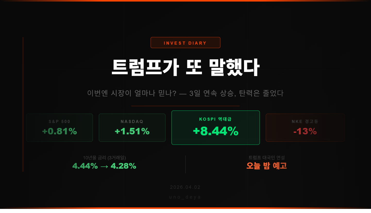다만 숫자가 말해주는 게 있다. 어제 +2.9%에서 오늘 +0.81%로 확연히 탄력이 줄었다. 시장이 트럼프의 말을 조금씩 할인해서 듣기 시작했다는 뜻이다.